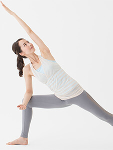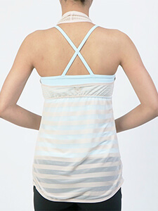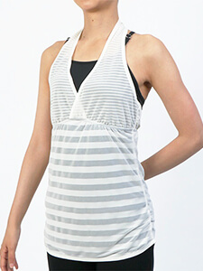 インナーとアウタートップが合体したレイヤードトップ。吸水速乾、消臭、UVカット機能と優れた機能を持つインナーと、透け感のあるボーダー素材のコンビネーション。身体のラインを上手にカバーしてくれます。逆転のポーズではインナーをウエストインして着用するとお腹めくれが気になりません。
