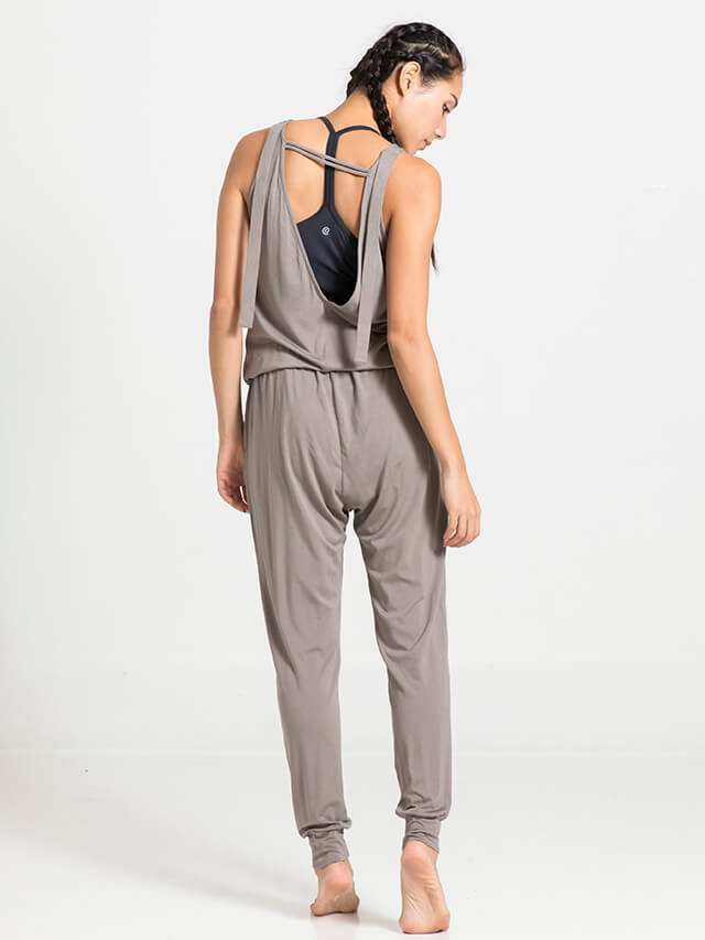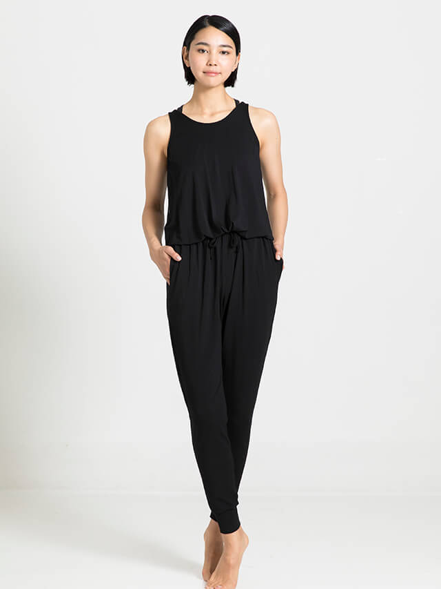 フロントはシンプルなのに背中の大胆な開きのギャップが艶っぽいオールインワン。しっとりとした素材が肌をなでるような感覚で着心地良い。暑い季節にブラトップとのコーディネートで涼しく快適に。逆転のポーズや前屈も躊躇することなく、ヨガに集中できます。