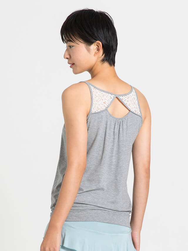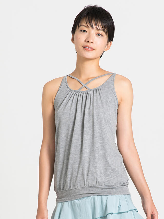 デコルテデザインにバックレースストラップが華奢で綺麗なトップス。落ち着いたカラーリングにふわりとゆとりのあるラインがウエスト周りをカバーし普段使いでも合わせやすい1枚です。