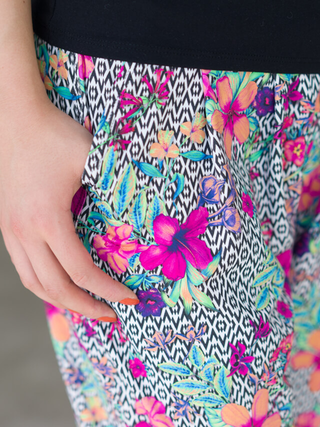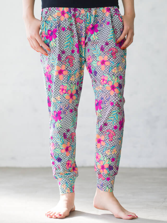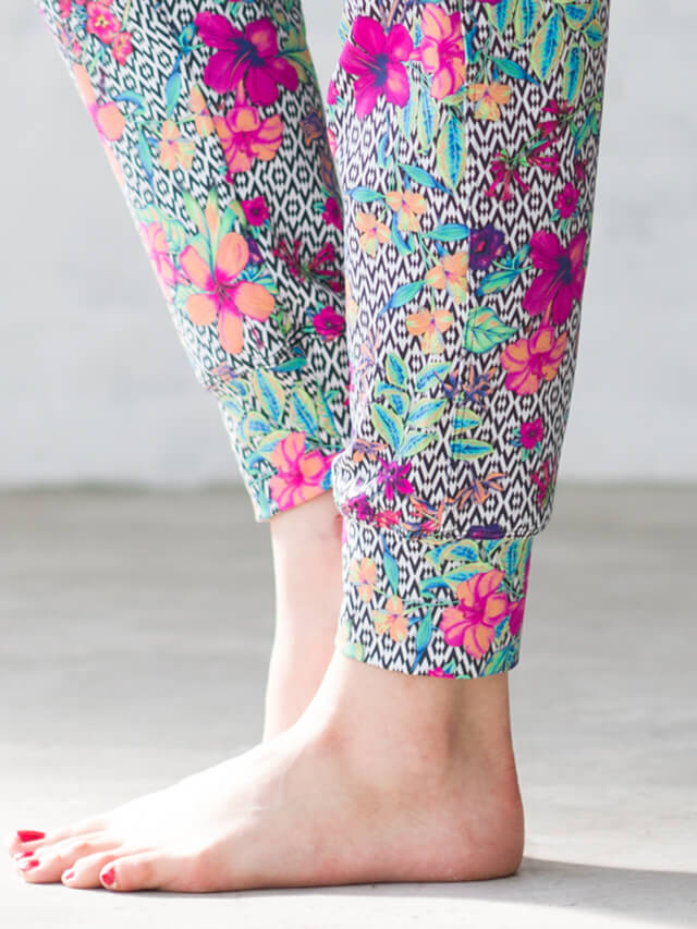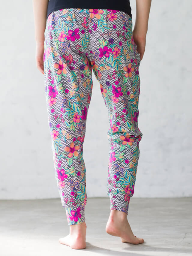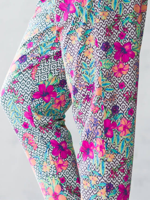 モノトーンのジオメトリック柄を背景にボタニカル×フラワーの大人かわいいプリントができました。キュート&クールなプリントがスパイスのきいたデザインです。ヨガだけにとどまらす、デイリーでも着たくなる着心地の良いパンツです。