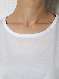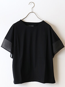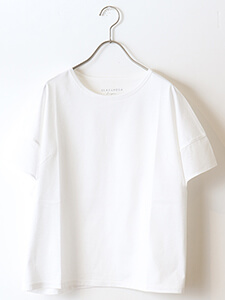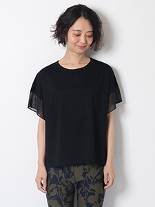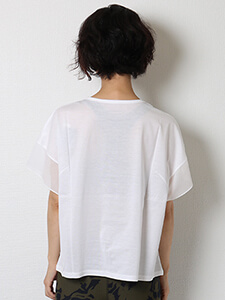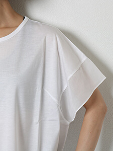 ゆったりシルエットのTシャツ。素材は綿100%ながら、かすかに光沢のあるミヌレ天竺を使用することで上品に仕上げています。異なる素材に切り替えた袖もポイント。長めの袖が二の腕をカバーしてくれるだけでなく、上品な透け感によって軽やかに見せてくれます。