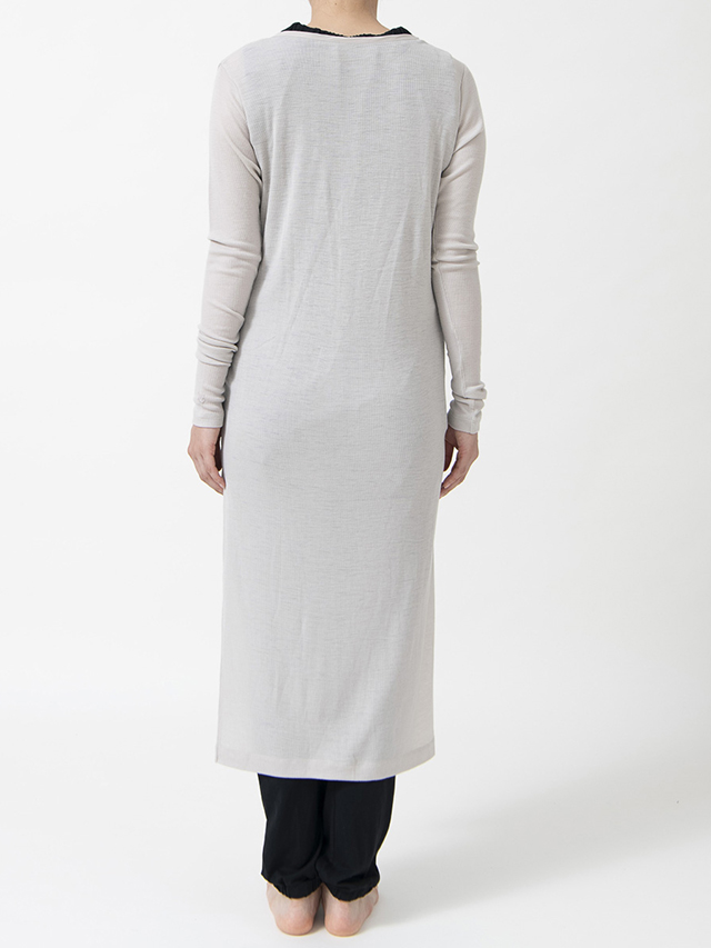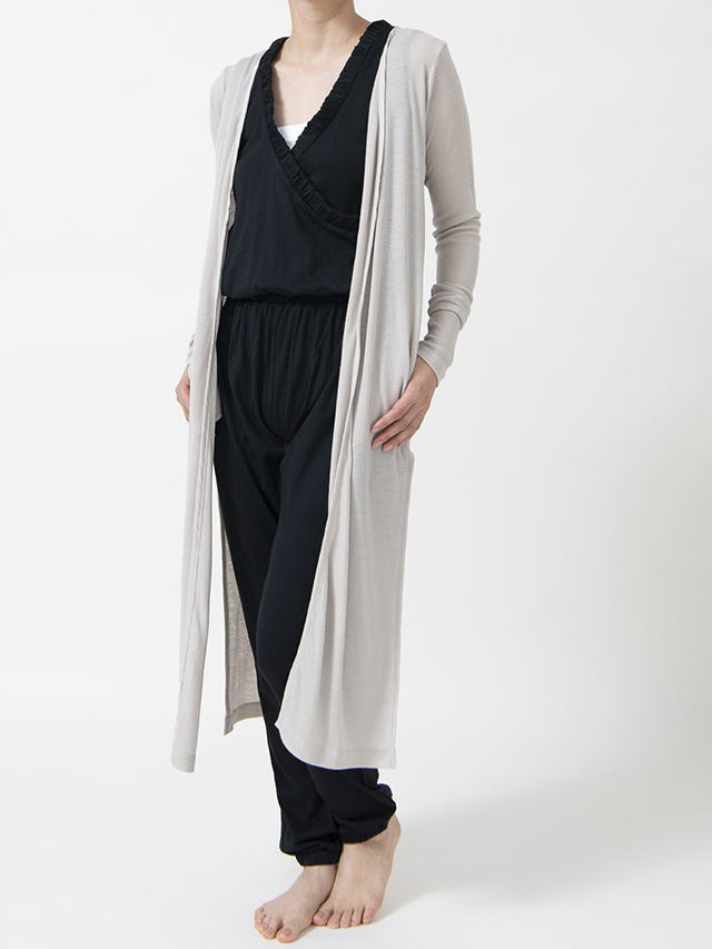 前開きはVネックでよりすっきりとした印象に。フロントはボタンではなくスプリングホックで止めることによって前を締めてもすっきりと着ていただけます。