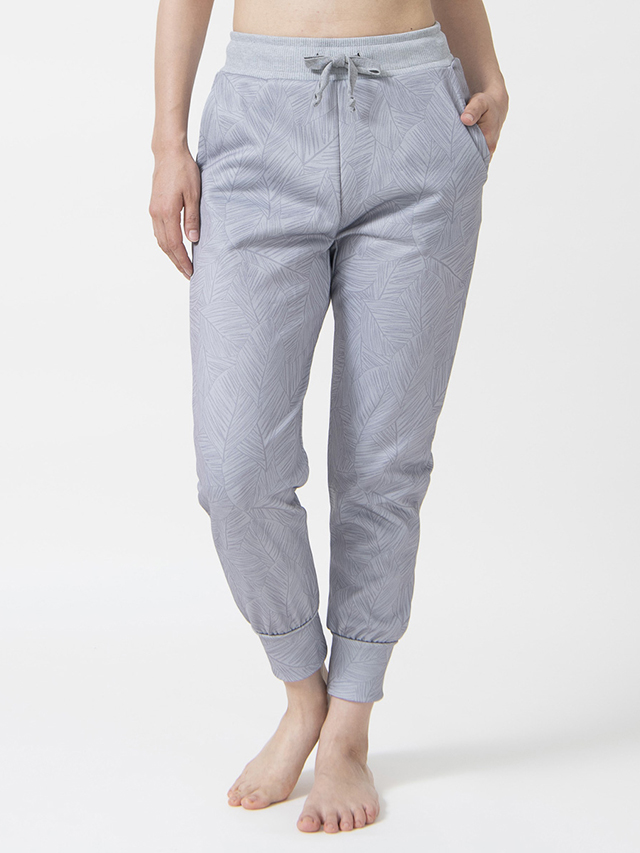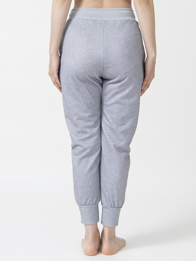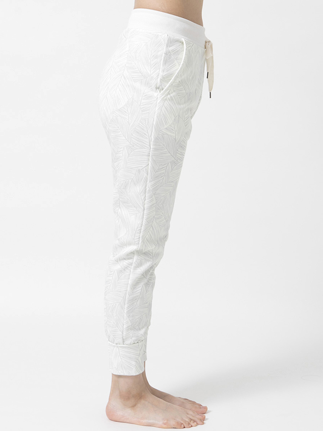 履き込みが深めの股上は、動いても安心のフィット感。裾リブはあえての共地使いで、足首まわりをすっきりと見せてくれます。女性らしい程よいサイズ感で、ヨガだけでなく普段着としてもおすすめの1枚です。