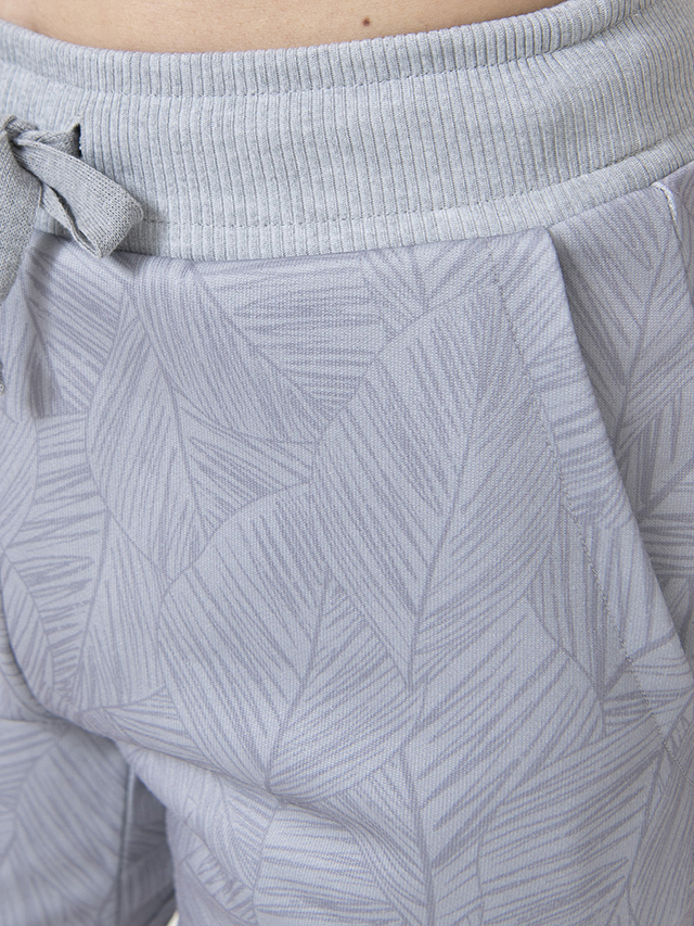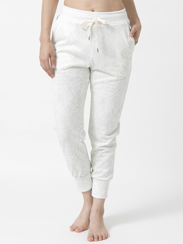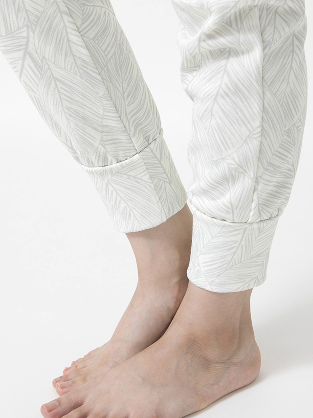 シーズンテーマとリンクしたリーフ柄の総柄プリントのスウェットパンツ。ベースのカラーに馴染むような総柄プリントは主張しすぎず、ほどよいアクセントに。