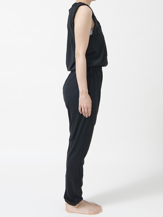 CMD天竺を使用、レーヨン50%、綿50%の少しとろみのある素材。伸縮性があるので、ヨガクラスでも突っ張らず快適に着用いただけます。今期はロングカーディガンを合わせて縦ラインを強調したスタイルアップなコーディネートがおすすめです。