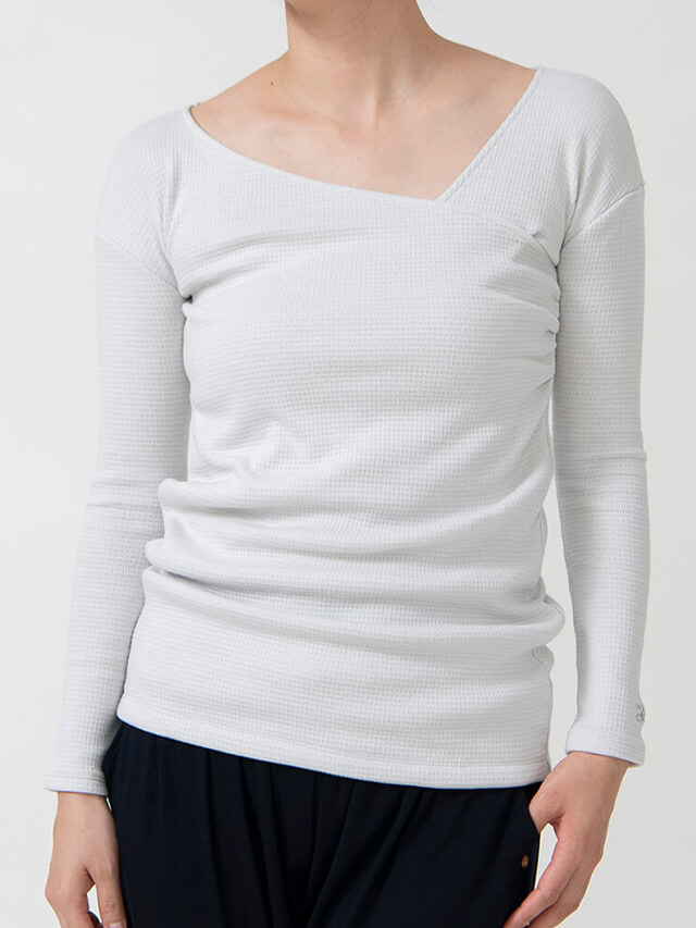 衿ぐりのアシメトリーが女性らしいカシュクールトップス。ニットのようなふんわりとした生地感のワッフル素材を使用しています。