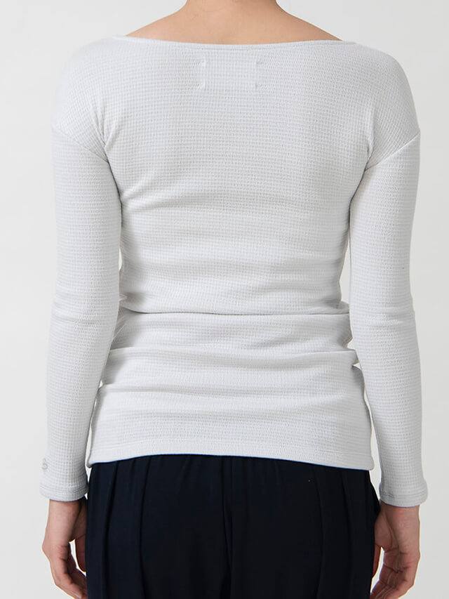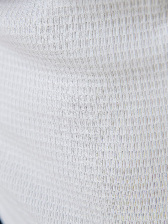 程よい厚みのストレッチワッフルハニカム素材を使用した長袖トップス。ハニカムとは8角形という意味で一般的なワッフル素材より縦に長いデザインが特徴です。コットンベースにポリウレタンが1%入っているのでコットンの肌触りなめらかに加え伸縮性にも優れています。
