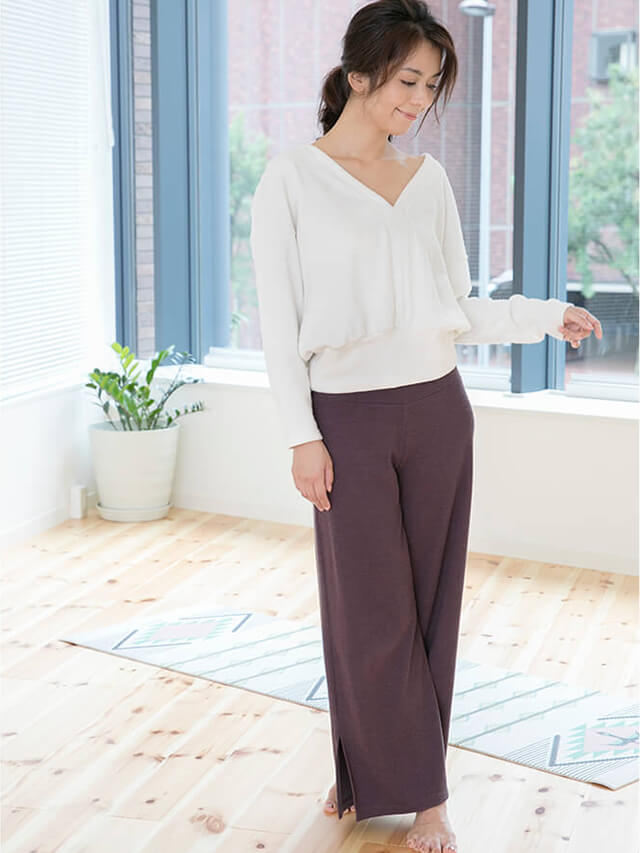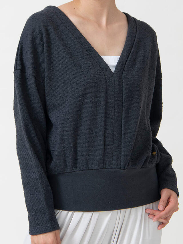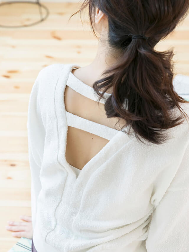 首周りと鎖骨が綺麗に見えるので女性らしく着こなせます。裾のリブは長めの厚手作りでヨガクラスも邪魔になりません。肩周りと身頃はゆったりシルエットですが着丈は短めに設定したことでトレンドのワイドパンツに合わせてスタイルよく着こなせます。