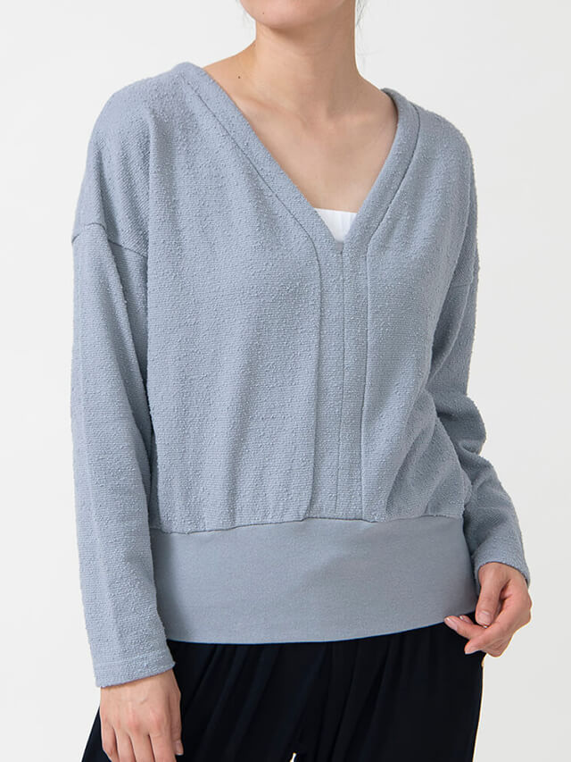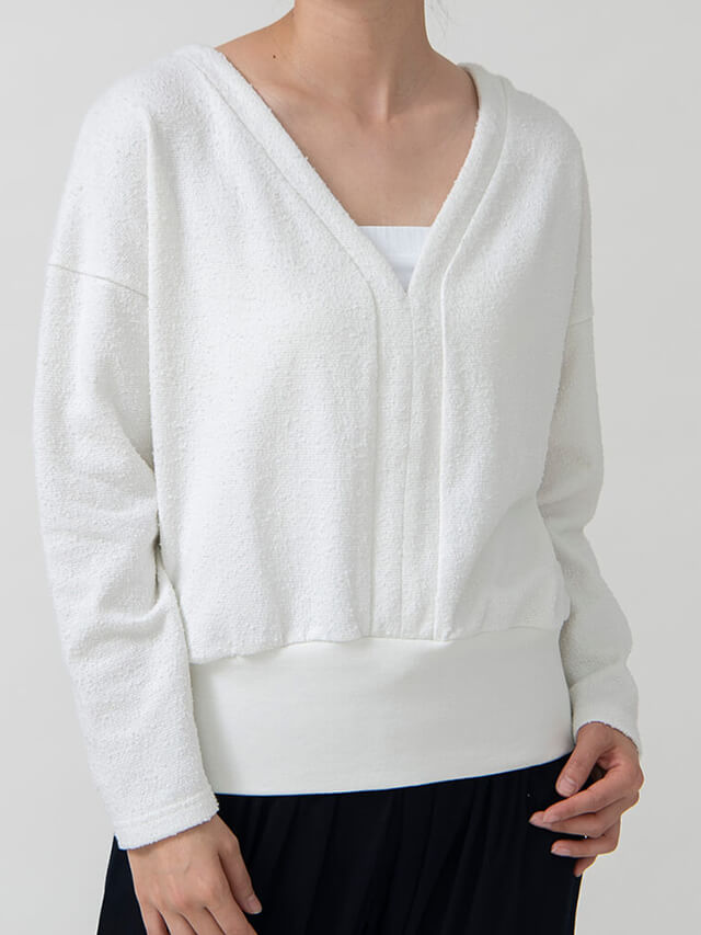 ぽこぽこした素材が温かなブークレ風ルーズフィットトップス。背中と胸元の広めのYネックがデザインのポイントです。