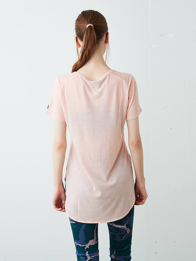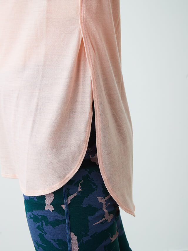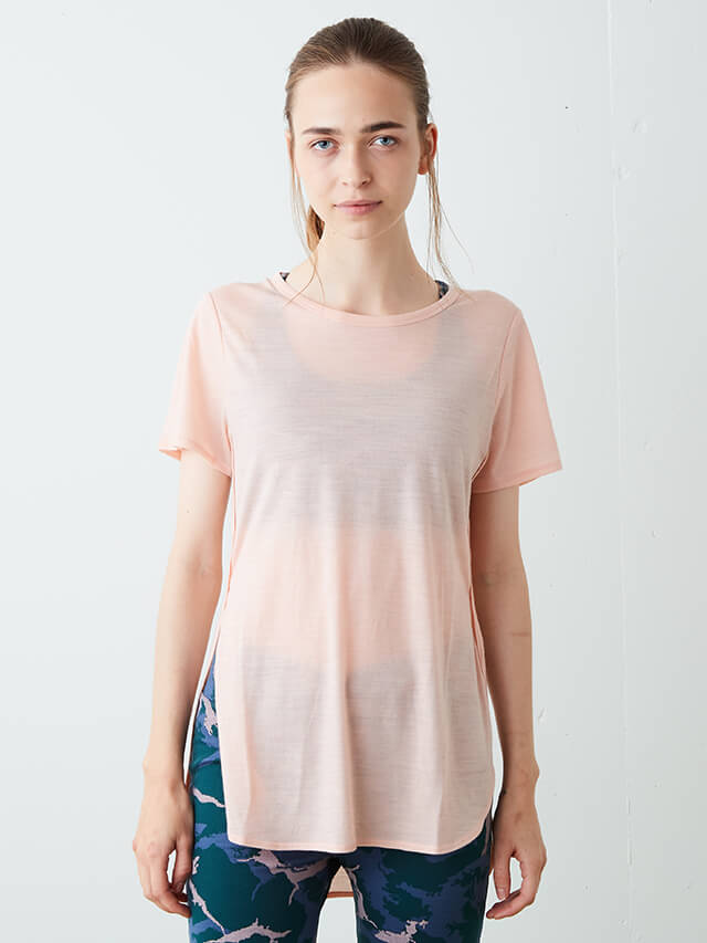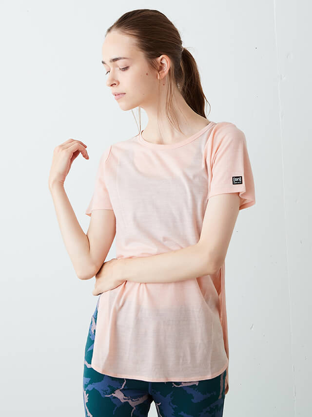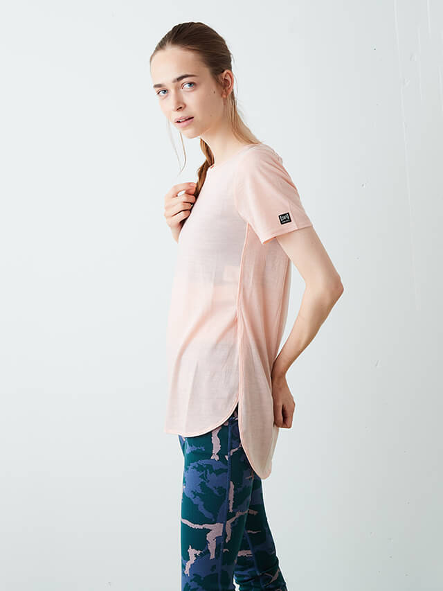 前着丈は短く、後ろは長めの着丈で動きやすさを確保しつつ気になるヒップをカバーしてくれるTシャツ。日本向けに企画された商品で、日本ヨギーニの要望を反映して製作されました。逆転のポーズの時、アクティブに動きたい時は裾を結んでショートトップとしても着用可能です。ブラトップの上に重ねるレイヤードTシャツにおすすめです。