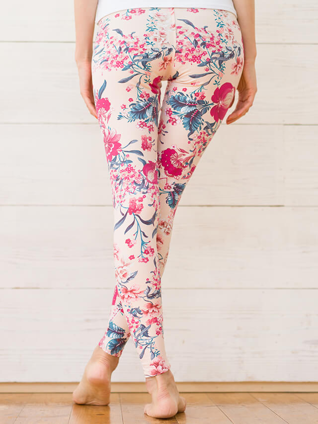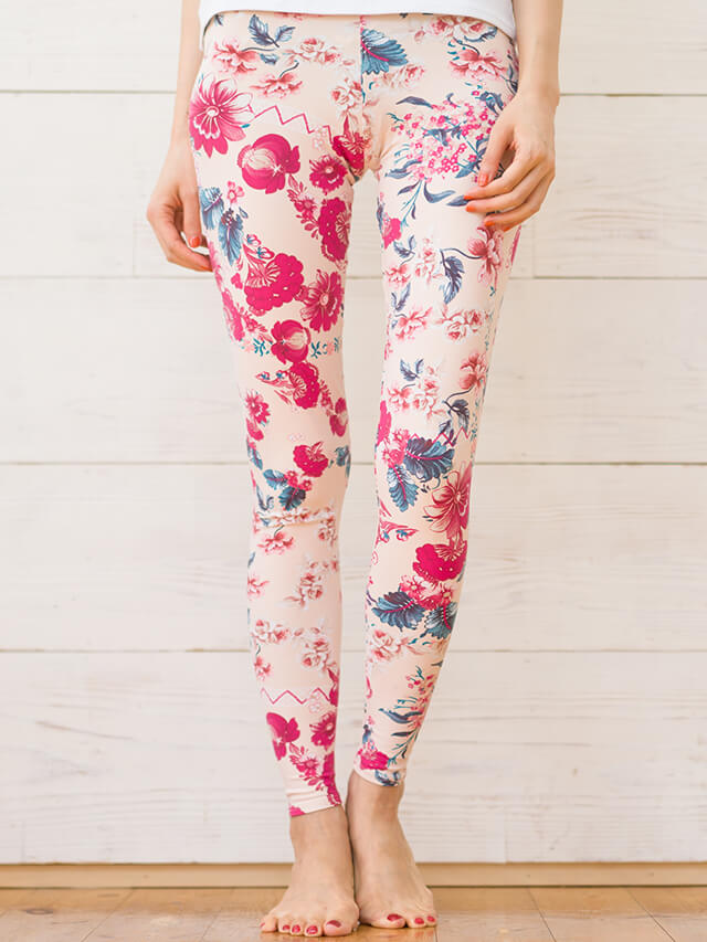 ピンク系のベージュのベースカラーとビビットピンクの上品な花柄が女性の心をくすぐります。フェミニンなコーディネートが叶うキュートなレギンス。