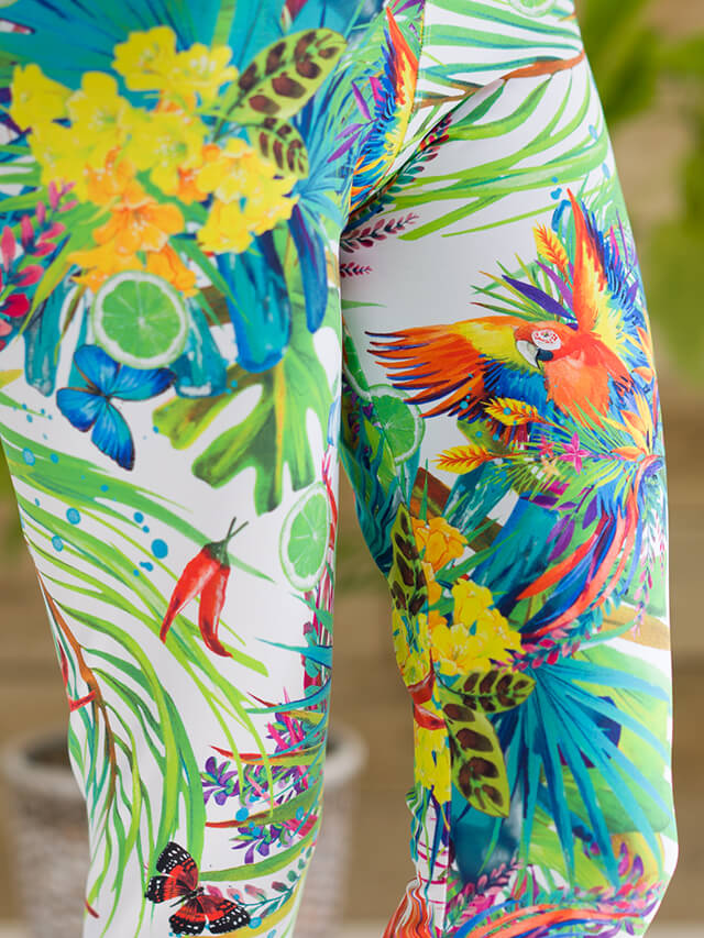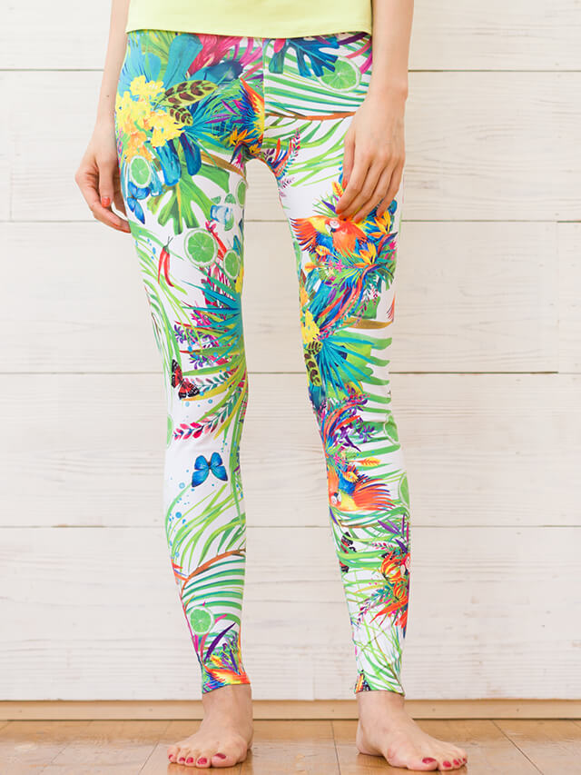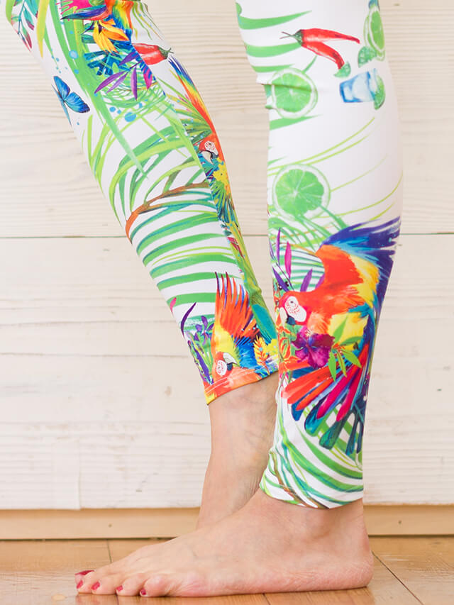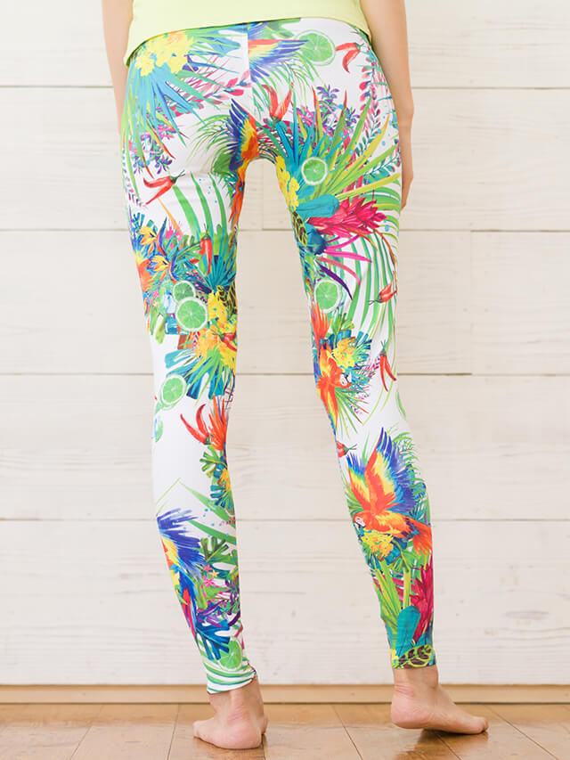 リンダワークスらしいカラフルなトロピカルテイストのプリントが楽しいレギンス。
