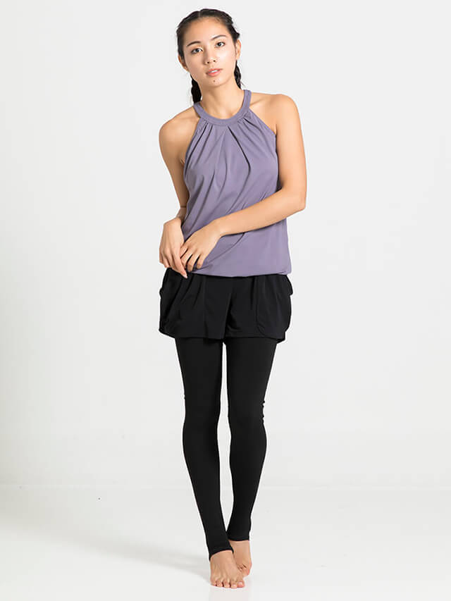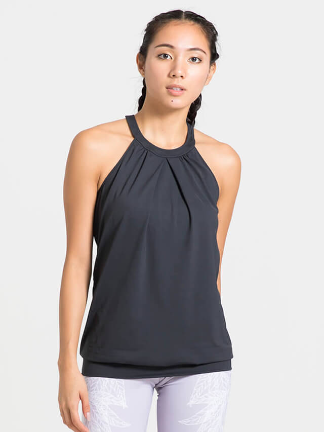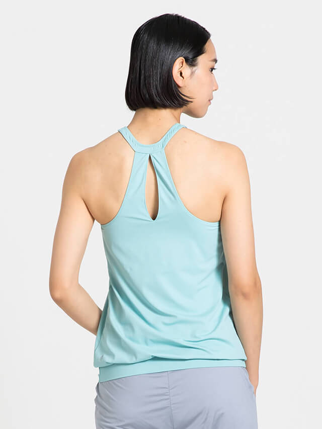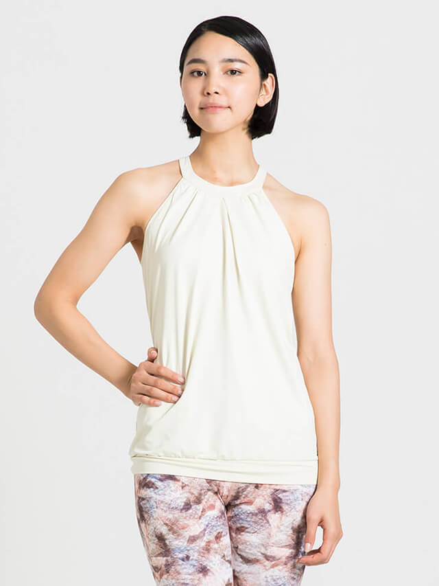 肩を華奢に美しく見せてくれ胸元の開きの気にならない安心のホルターネック風デザイン。軽くて柔らかい吸汗速乾機能のある素材は身体を動かしやすく大きな動きのあるポーズやホットヨガでも快適な着心地です。