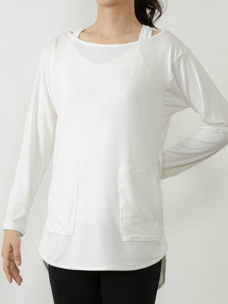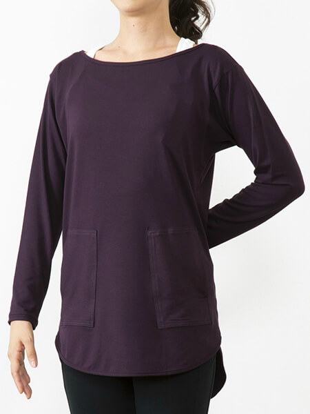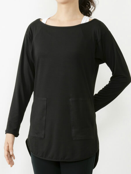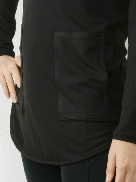 暖か素材でスカーサナやパドマーサナ等座位の時もお尻をカバーして体を冷えから守ります。後ろの丈が長めなのでレギンスとの相性◎。ラウンドテールがヒップラインを美しく見せてくれる効果も。パッチポケットがシンプルTシャツにアクセントをもたせます。寒くなる季節のレッスンウエアにおすすめです。注)画像は、Tシャツの下にノースリーブトップを着用しています。