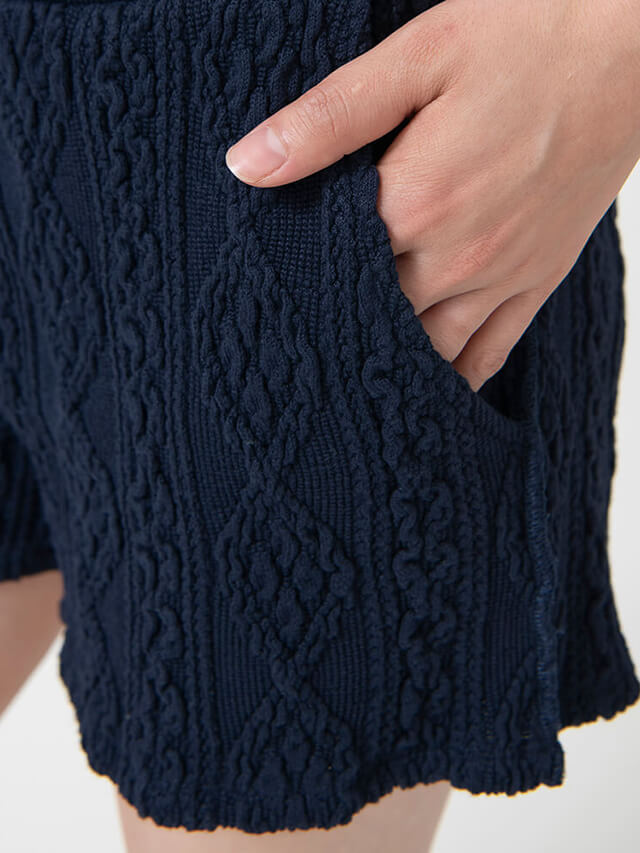 ニットのようなケーブル模様をジャガード編みで表現した存在感のあるショートパンツ
