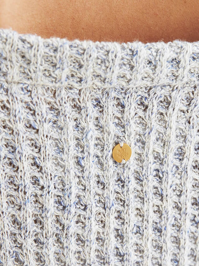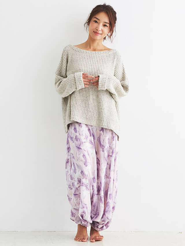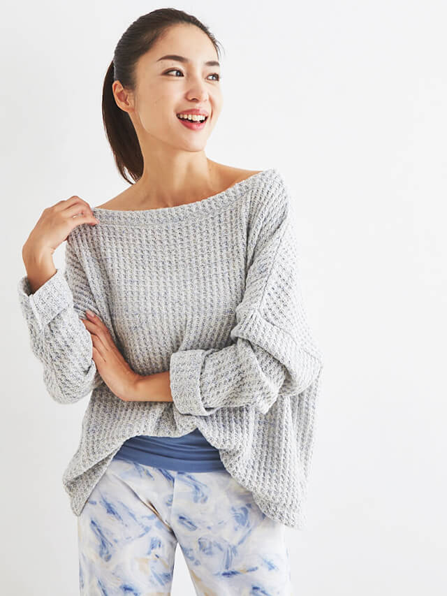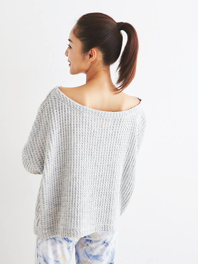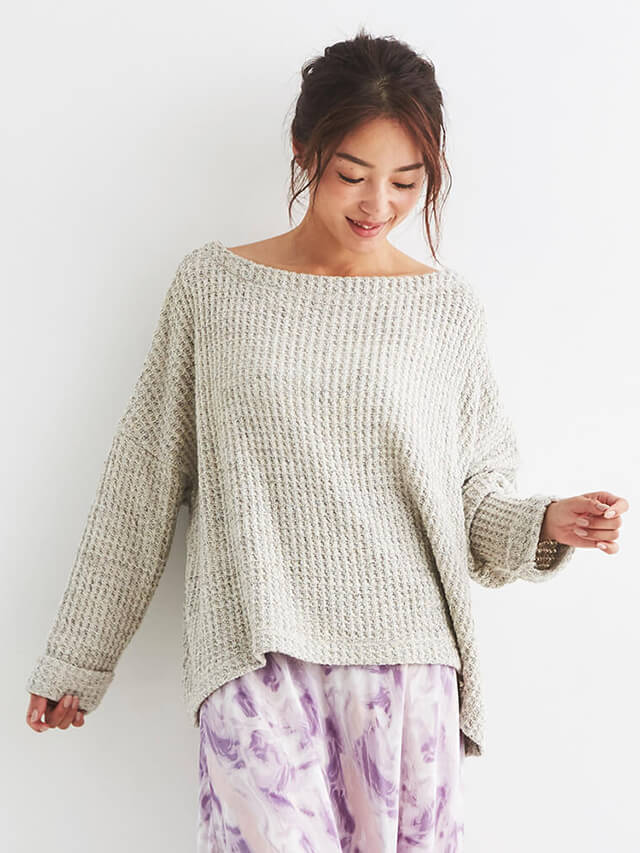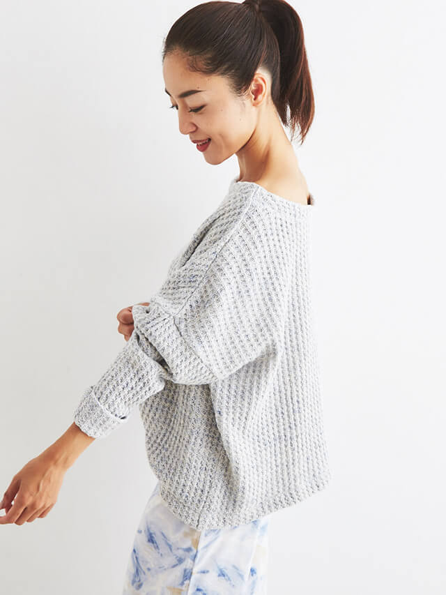 不均一な太めのスラブ杢糸を使用し衿、裾始末が折り返し、袖口がロールアップになっているので柔らかい雰囲気のニットに見えるワッフル素材を使用。アーチ状のヘムラインが特徴で様々なボトムと合わせやすいデザインです。お家でのリラックスはもちろん、レッスンの行き返りに軽く着れるトップスです。