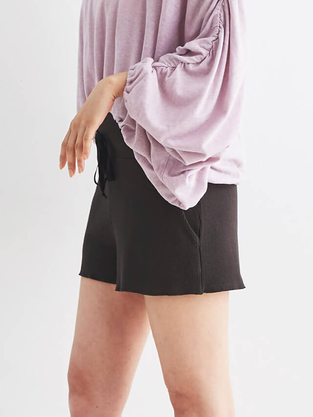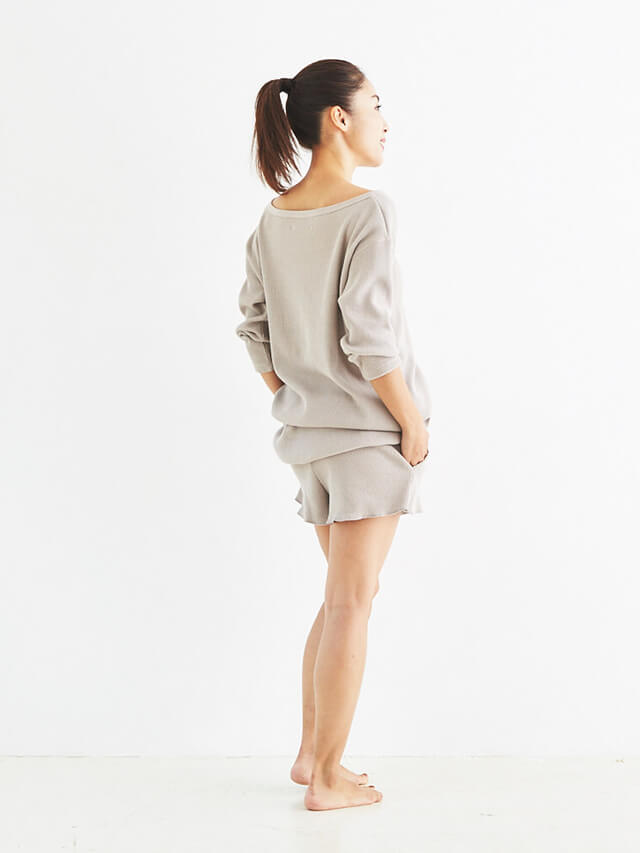 裾口は折り返しなしのロック始末で肌あたりが良く、軽やかな印象です。裾口広めで脚が細く見える効果も嬉しいポイント。ラフィーコットンは不揃いな糸質で、ヴィンテージな質感が特徴の素材をワッフル組織にすることで、肌馴染みも良く、伸縮性をアップさせた生地。作りこまれたヴィンテージ感で大人が履けるかっこいいショートパンツです。裾口が広いので、ヨガ時の着用では中にレギンスをご着用ください。