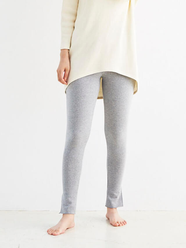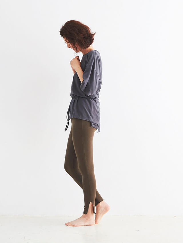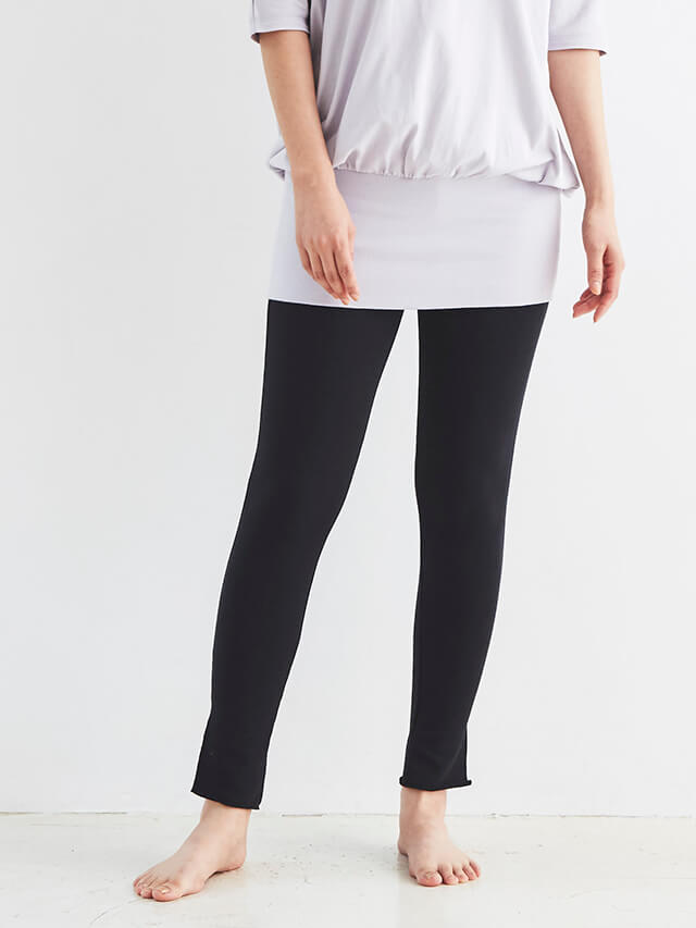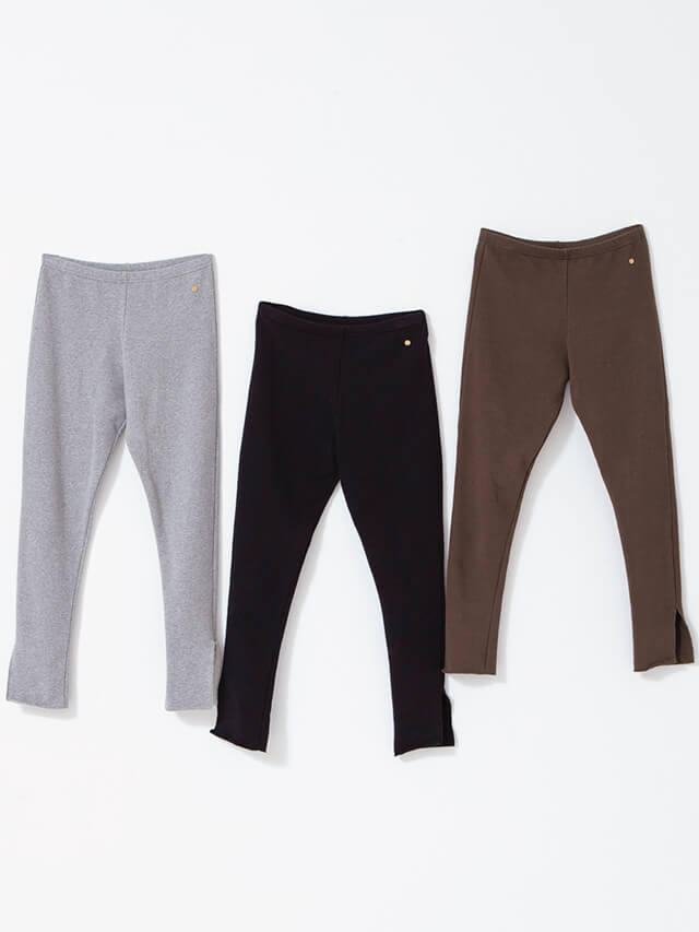 肌さわりの良いコットン素材にゆとりをもたせたアンクル丈のレギンス。伸縮性の良い薄手のストレッチ裏毛素材で履き心地も◎。裾を折り返しなしのロック始末で肌あたりが良く、すっきりとしたデザイン。アンクル丈+スリットで足さばきも良く動きやすい。