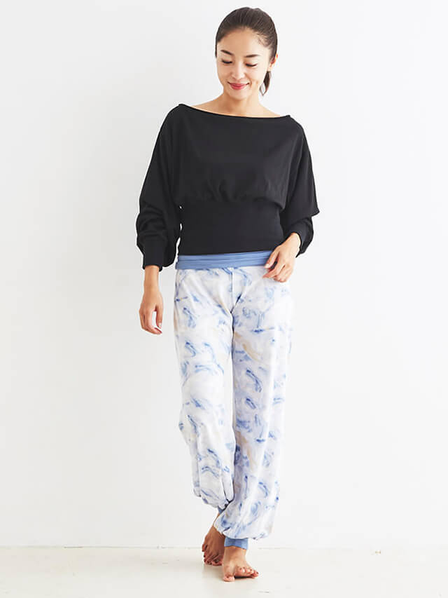 美脚効果のある定番シルエットで人気のバブルパンツにマーブル柄が登場。肌触りと質感が魅力のコットンレーヨン素材でリラックススタイルにもピッタリなボトムスです。