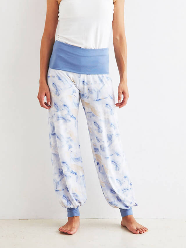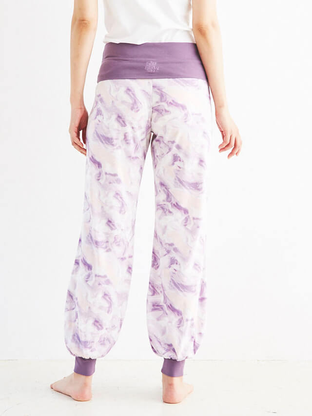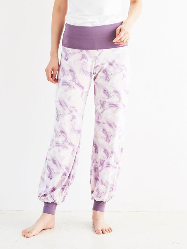 通気性と速乾性に優れたレーヨンと、肌触りと質感が魅力の綿の特徴を併せた履き心地の良い素材を使用した人気のボトムス。2019年春夏シーズンテーマのTruth(真実)をイメージしたマーブル柄が柔らかな女性らしい印象です。体形カバーもしながらすっきりとしたシルエットのバブルパンツです。