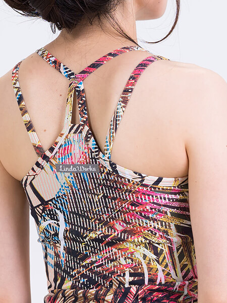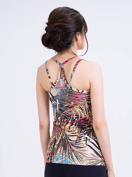 トップスは落ち着いたベージュの地色にのびのびと描かれたやしの葉っぱから植物の持つエネルギーを感じられるプリント。朝日に照らされた様子や海を連想させるカラーリングでリーフがロマンティクに彩られています。UPF50+でUVカット機能もついているので外ヨガでも安心。 ブラカップ付です。