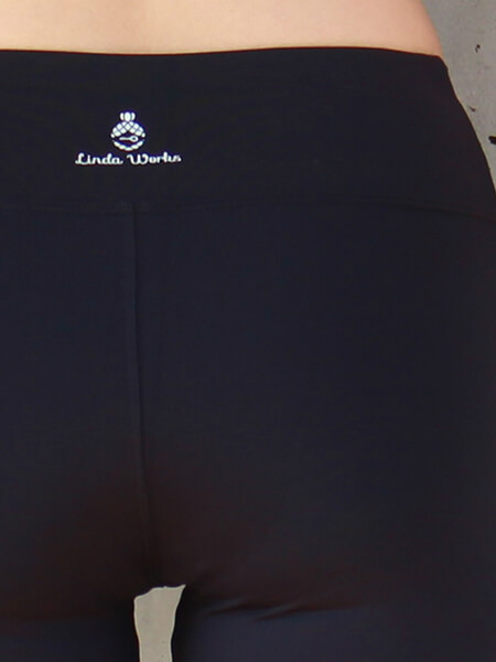 ボトムスは初心者から上級者まで幅広く支持される無地のヨガレギンス。初めてのヨガウェアにとってもおすすめなベーシックな一枚です。締め付け感はなく、軽くて柔らかい着心地。摩擦に強く、良く伸び縮みするのでどんな動きも邪魔をしません。UPF50+で紫外線をシャットアウト。後ろの腰部分にはリンダワークスのロゴ入りです。