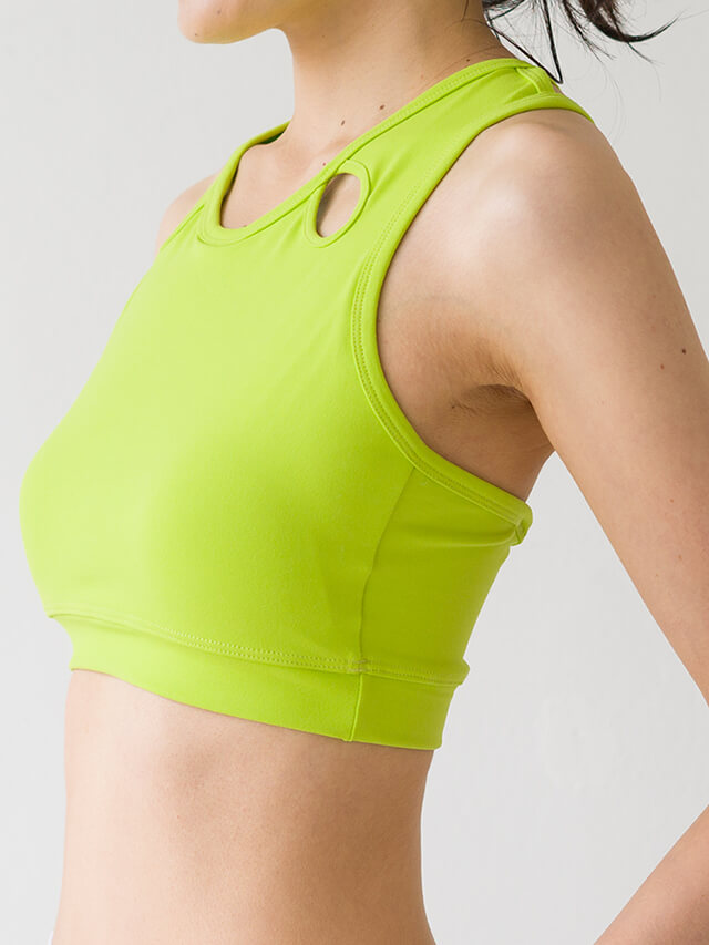 程よいホールド感で胸元をサポートしてくれるブラトップ。厚みのある生地でも速乾性に優れ、ストレッチ性が高いのでストレスのない着心地です。首回りは空きの少ないデザインでどんなアーサナでもちら見えの心配なし。左右の鎖骨部分にアクセントがあるフロントスタイルに背中のダブルストラップでヘルシーな肌見せを楽しんでください。