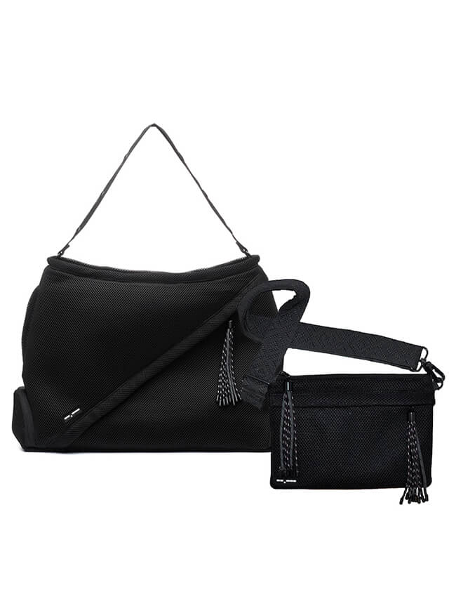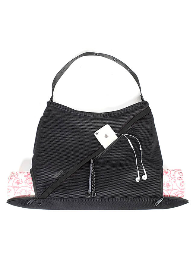 また、バッグインポーチがついており、ストラップと組み合わせればショルダーバッグとしても使える優れもの。素材は手入れが簡単なメッシュ素材を使用しています。着用後のヨガウェアを入れられるランドリーポーチも付属。朝活後の仕事やお出かけもスマートに向かえます。デザイナーの細やかな心遣いをたっぷりと感じられるバッグです。