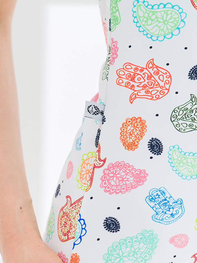 中東に伝わる呪いから身を守ってくれるお守りの意味を持つハムサモチーフ。ポップなカラーリングで描いたユニークなプリントです。