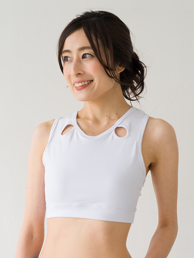 程よいホールド感で胸元をサポートしてくれるブラトップ。厚みのある生地でも速乾性に優れ、ストレッチ性が高いのでストレスのない着心地です。首回りは空きの少ないデザインでどんなアーサナでもちら見えの心配なし。左右の鎖骨部分にアクセントがあるフロントスタイルに背中のダブルストラップでヘルシーな肌見せを楽しんでください。