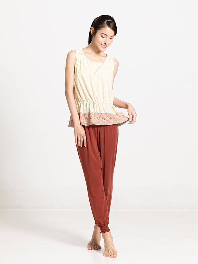 ブラ付きタンクトップとは思えないナチュラルさと女性らしさ。アールヌーボー柄でワンランク上のヨガスタイルに。