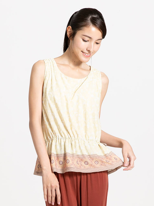 ナチュラルな雰囲気を出したい方におすすめ!スリアオリジナルのアールヌーボー柄をのせた個性的なブラ付きタンクトップ。 透け感があり、優しいナチュラルな印象になるのが特徴。明るいカラーリングでコーディネートを華やかにしてくれます。