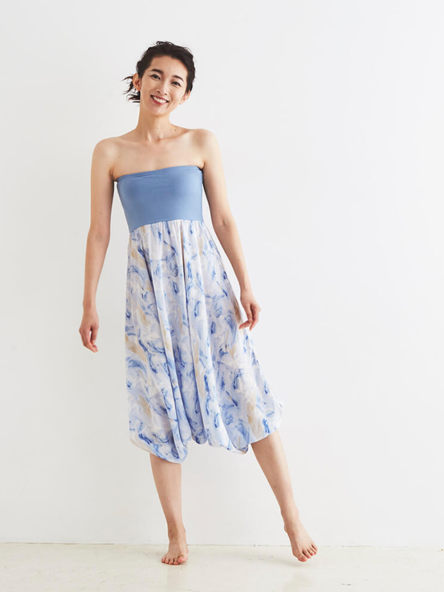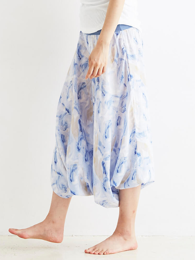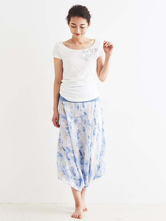 ボトムスはヨギー・サンクチュアリの名作ジニーパンツのマーブル柄。独特なボリューム感がたまらないアイテムです。柔らかな女性らしい印象でゆったりとしたデザインが体形カバーしながら締付けなしの極上リラックスパンツです。レーヨン独自の光沢とドレープ性に通気性と速乾性をプラス。胸まで上げて、オールインワンの様な着こなしも楽しめます。胸元にはパッドが入れられる仕様なので、オールインワンとして着用する際には、お手持ちのパッドを入れてご着用下さい。