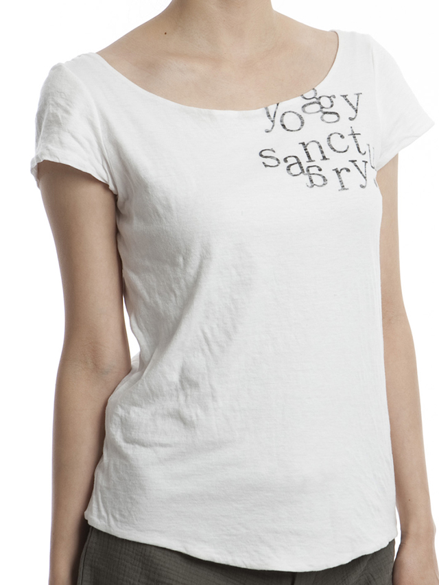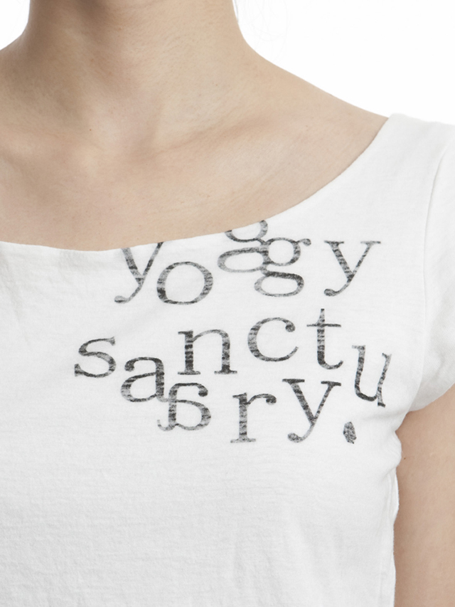 トップスは オーガニックコットンガーゼを使用した生地を2枚重ねした着心地、肌触り抜群のTシャツ。ロゴのプリントをあえて鮮明にしすぎないよう裏からプリントにしている技ありデザインが、大人女性に人気の理由。ヨギー・サンクチュアリで一番売れているトップスです。