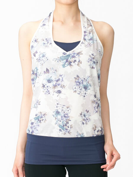 トップスはブラトップとホルターネックタンクがセットになったアンサンブル。お得感があり、コーデにも悩みません。それぞれ単品でもお使いいただけます。インナーのブラトップは吸水速乾・消臭機能に優れた優秀アイテム。アンダー部分は幅広で安定感があり、アジャスター付きのストラップが細かく調整できるのでストレスなく着ていただけます。トップは深めにカットしたVネックがデコルテラインをすっきりと見せ、インナートップとのバランスも良いのが魅力です。裾部分にも吸水速乾素材を使用しているので、ホットヨガにもおすすめです。体型をカバーしてくれるシルエットながらウエストはフィットするのでアクティブなヨガでも安心して動くことができます。