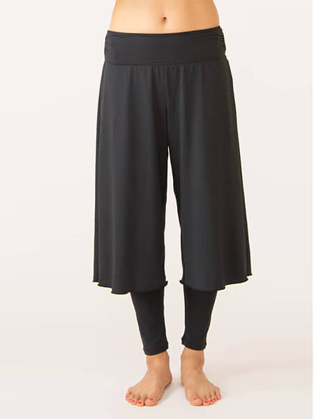 ボトムスはチャコットと当店でコラボレーションして作り上げたレイヤードガウチョ。ガウチョパンツとレギンスが一体になったアイデア商品。軽量でUVカット効果、防臭効果、吸汗速乾機能のあるツインコット素材を使い、エレガントな雰囲気になるようなデザインに仕上げました。 そして、この機能素材を使うことによってレイヤードガウチョで最軽量の217グラムという軽さを実現。 サイドのスリットが大人らしい魅力を演出し、さらにスリット部分を結ぶことで逆転系のポーズにも対応します。