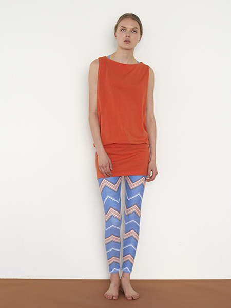 ジュリエの定番人気商品「コットンベア天バッククロスチュニック」と大人気で再生産を何度も行なっている「シェブロンプリントレギンス」を夏の太陽を彷彿とさせる注目カラーのオレンジでチャレンジ。