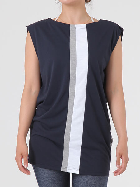 トップスはジュリエ人気商品のドライコット天竺ラインチュニック。縦のラインがデザインポイントです。背中に空き部分があり、インナーとの組み合わせを楽しめます。腰で止まるシルエットなので逆転のポーズにも集中していただけます。吸水速乾性に優れた機能素材です。コットンのような風合いが楽しめます。