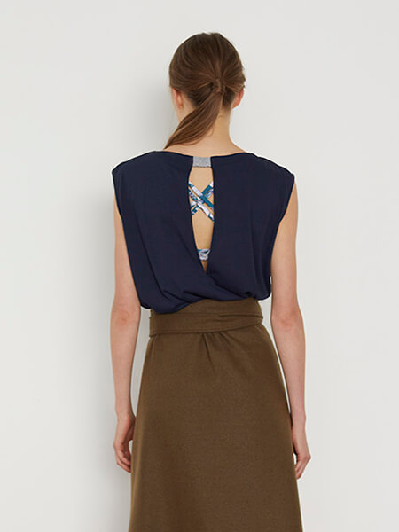 トップスに入ったラインと統一感があり、ネイビーのチュニックと好相性です。
