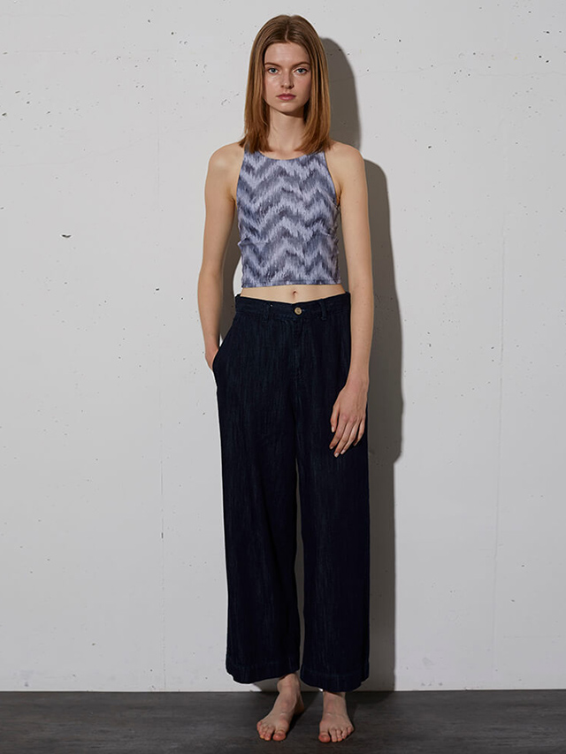水着素材を使用したショート丈トップスは、汗の多くなる季節を快適に過ごせそう。同柄ボトムスと合わせてセットアップコーディネートも可能。デニムとも相性が良いので、真夏のデイリーウェアとしてもご着用頂けます。