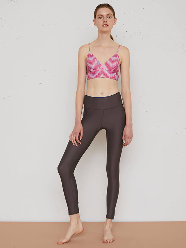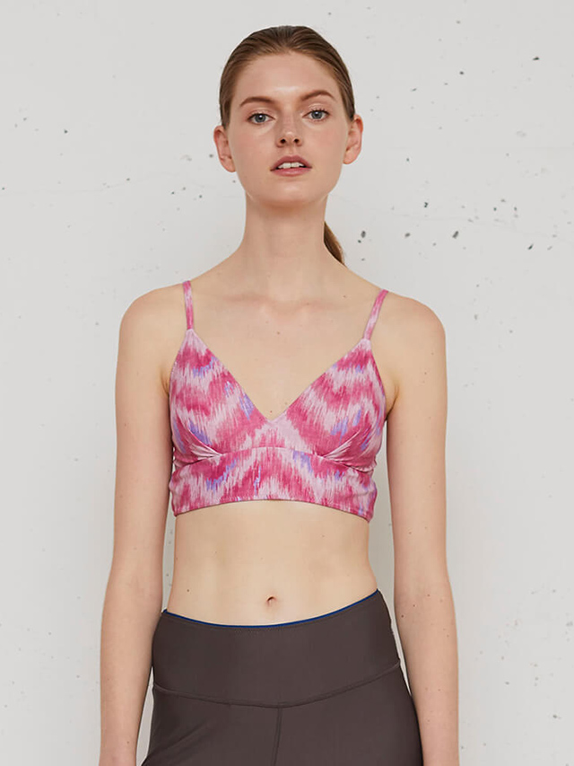 水着素材を使用したブラトップは汗や水で濡れても軽量速乾で快適。ホットヨガはもちろん、サップヨガやワークアウトなどにもおすすめです。人気のトライバルプリントがコーディネートのポイントです。