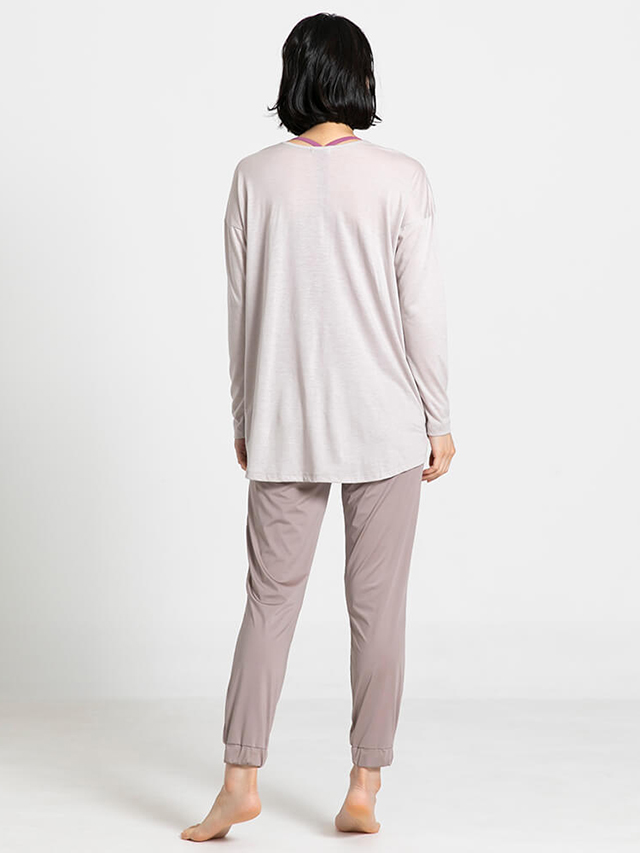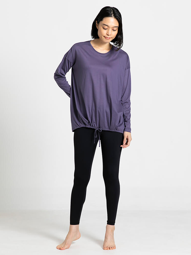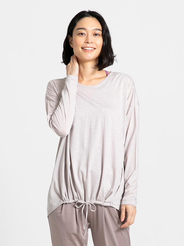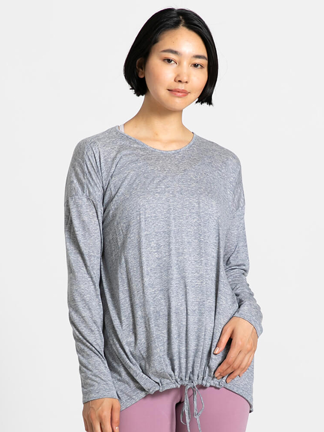 ゆったりリラックスシルエットのレイヤードトップス。裾に入ったタックが特徴的。好みで裾を絞りを調整でき、逆転のポーズ時でも絞りを強くすることでめくれ上がらず安心です。