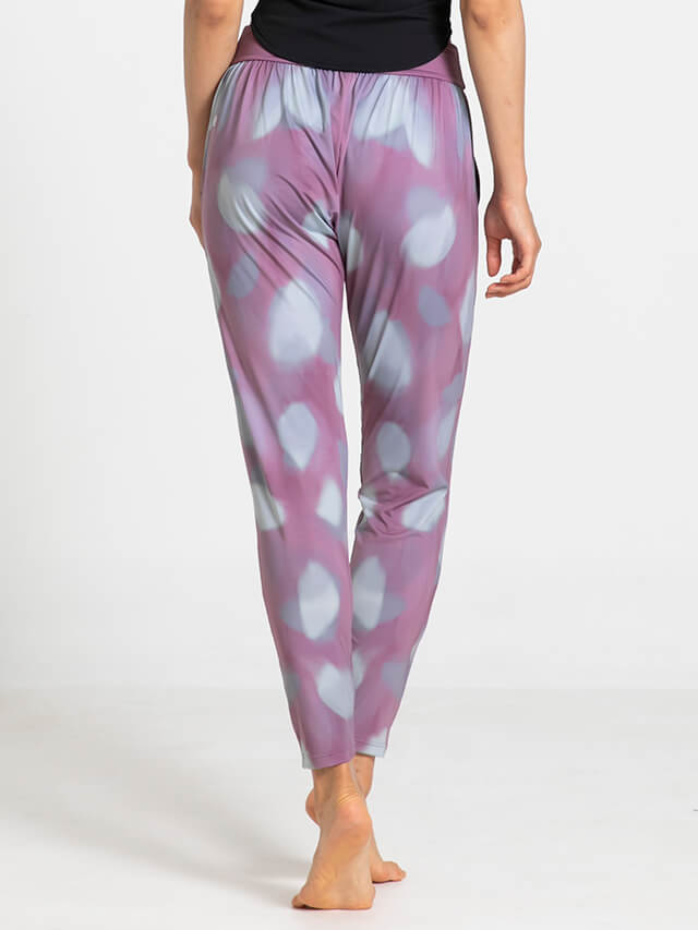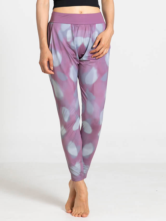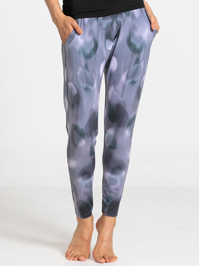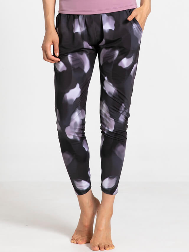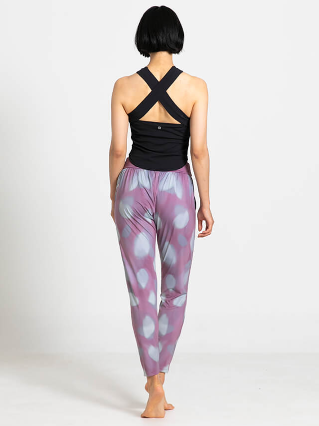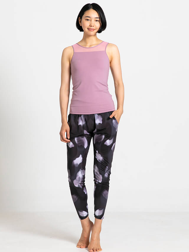 程よいゆとりのあるシルエットながら股上のあるデザインで脚さばきの良さも◎マットな表面感にソフトな印象のプリントが美しいボトムスです。ポリエステルストレッチは柔らかさと伸縮性を兼ねており速乾性にも優れた素材で常温ヨガはもちろんハード系ヨガやホットヨガでも快適な着心地です。