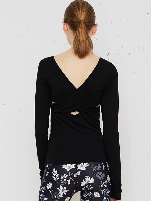 シンプルながらバックスタイルは大胆なクロスデザインで、背中をスッキリ見せてくれます。