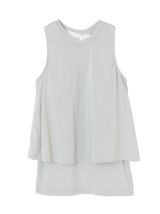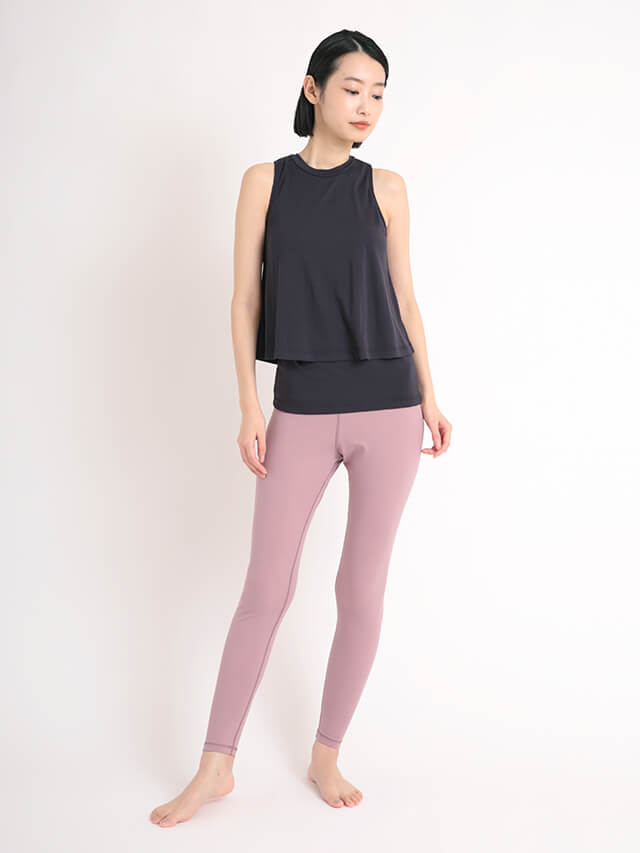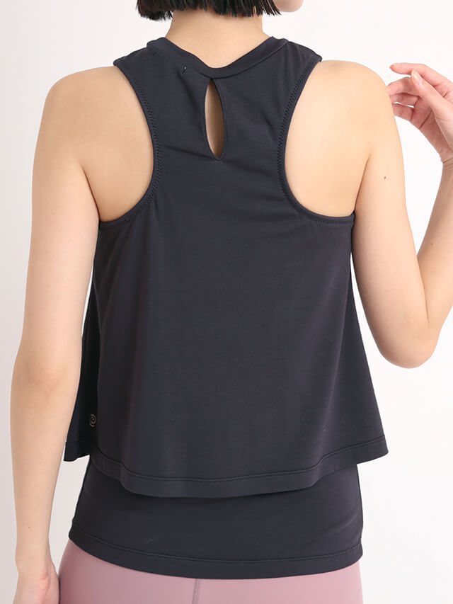シンプルで綺麗なカラーラインナップのデザインタンクトップ。裾は2枚仕立てになっているので、ボトムスに入れることもできます。バックスタイルは肩甲骨が動かしやすいデザインになっています。