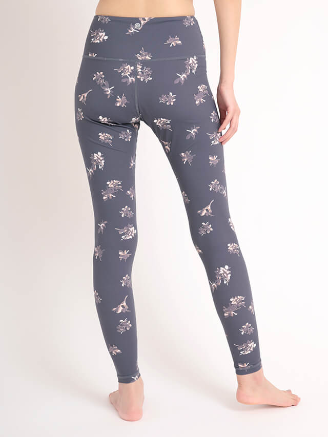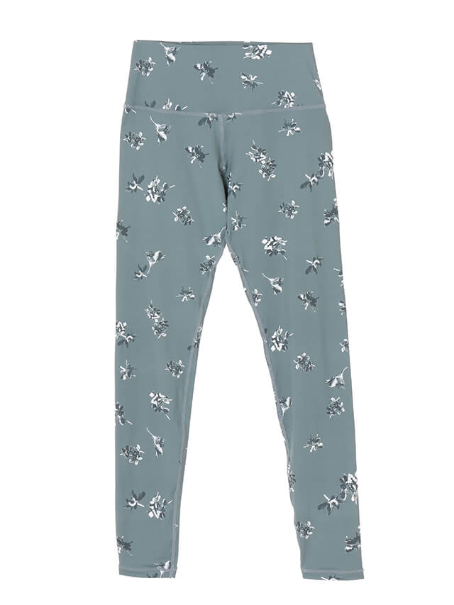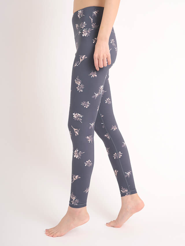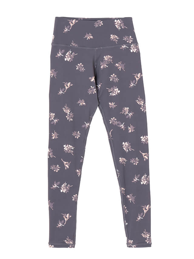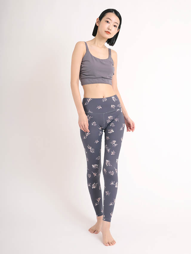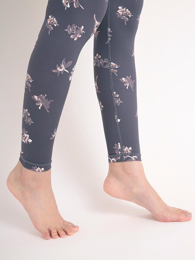 小花モチーフがキュートながら、ベースのカラーは落ち着いた色合いで、どんなトップスにも合わせやすい一枚です。柔らかく滑らかな手触りで、着心地抜群なアイテム。ストレッチ性に優れており、ボディシルエットを整える効果も期待でできます。速乾素材なので、常温ヨガはもちろん、ホットヨガにも快適に使用できます。