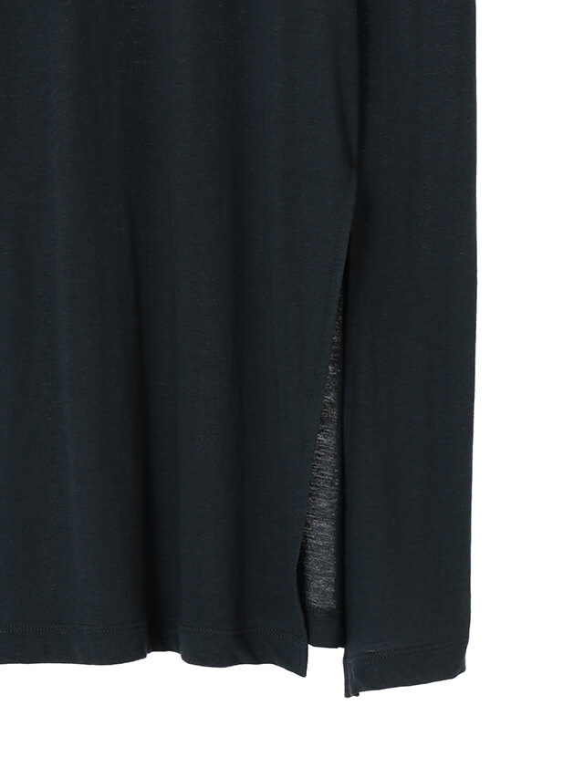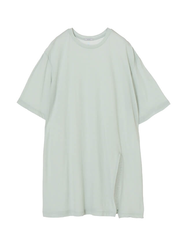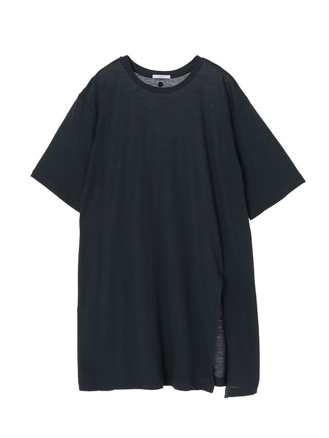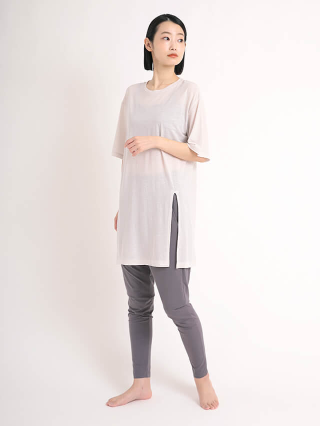 上質な素材の半袖レイヤードトップス。フロントに入ったスリットは、裾を結ぶことができるデザイン。レギンスはもちろん、裾を結んでパンツスタイルにも合わせられます。上上品な透け感のある風合いで、インナーとの重ね着を楽しめます。リヨセルの光沢感と美しいドレープ性に、麻の清涼感とコットンのナチュラル感を持ちあわせた素材を使用しています。細い糸を使い肌触りが非常に良く、カジュアルながら上品な風合いが特徴。