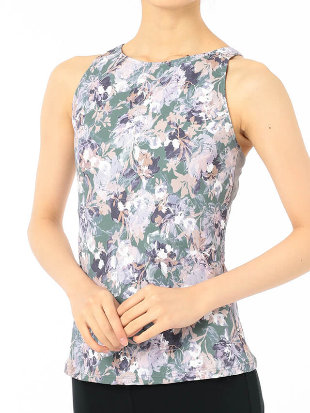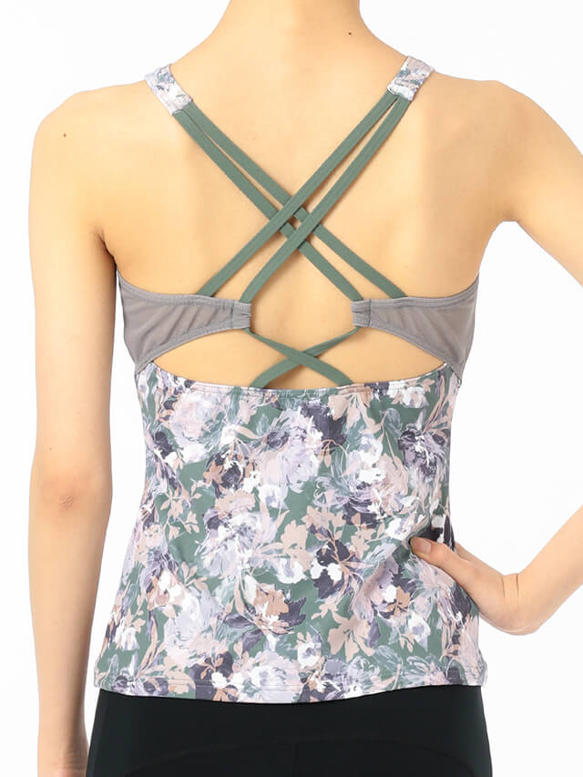 華やかなフローラルプリントに、バックのストラップ使いが存在感大!1枚で着られるブラパッド付タンクトップです。