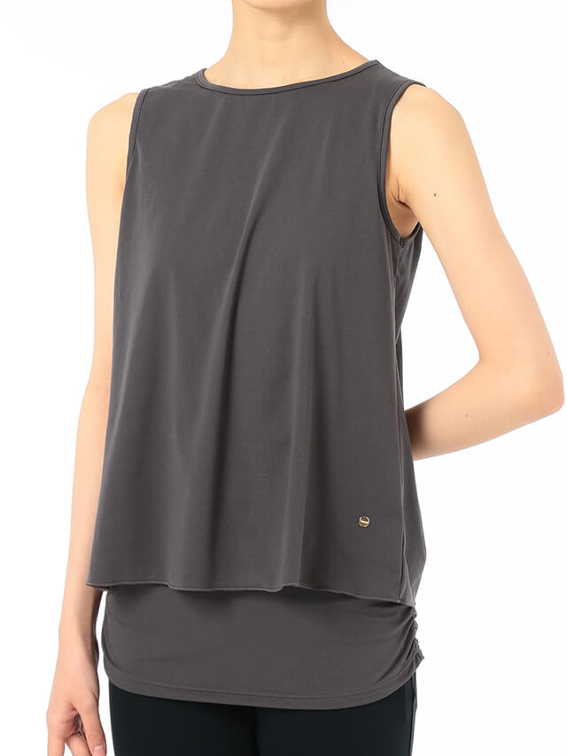 気になるお腹周りをカバーしてくれるレイヤードトップス。インナー部分は腰まで隠れる丈でレギンスとのコーディネートに最適な一枚。ヨガ中に邪魔にならないよう上身頃右脇にスリットを入れて結べる仕様になっています。