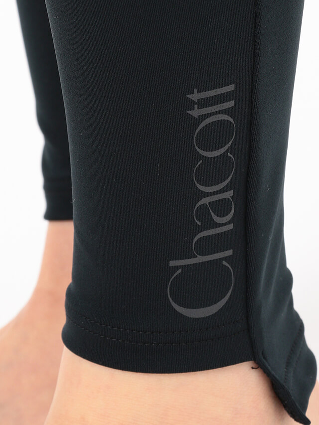 ウエスト周りはパワーネットを内蔵し、適度なサポート力と心地よいフィット感で、お腹周りをスッキリと見せてくれます。バックスタイルはヒップが高く見えるようなカットラインです。裾のラインはあえて少し段差をつけ変化を出したデザイン。裾のサイドにラバープリントでさりげないChacottロゴ入りです。